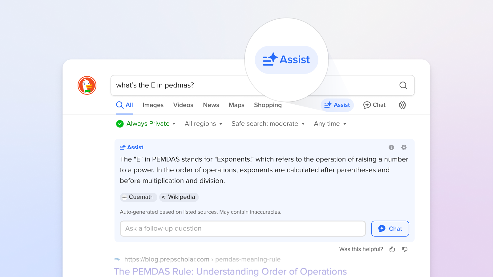 If you’d rather start with traditional search results, simply use DuckDuckGo search as usual. AI-assisted answers – previously called DuckAssist – will automatically appear on the search results page for relevant English language queries. You can also manually trigger an AI-assisted answer on demand by pressing the “Assist” button under the search box, which appears on most queries. The answers source information from across the web, and like Duck.ai, they are completely free and private, with no sign-up required.