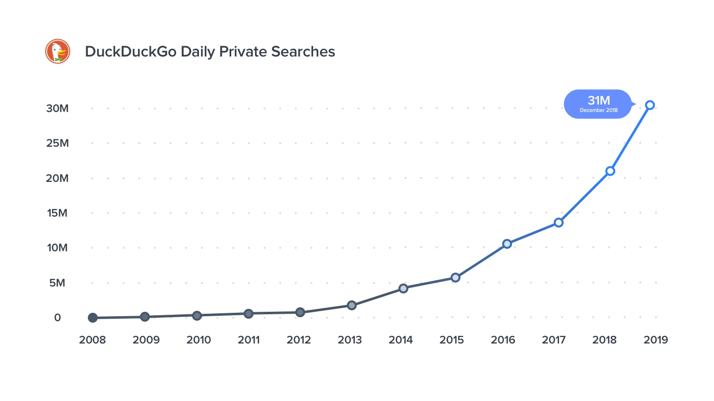 In terms of growth, 2018 saw our average daily private searches leap 63%, from 19 million to 31 million. To put things into perspective, that's 723% growth in average daily searches since the privacy zeitgeist of 2013.