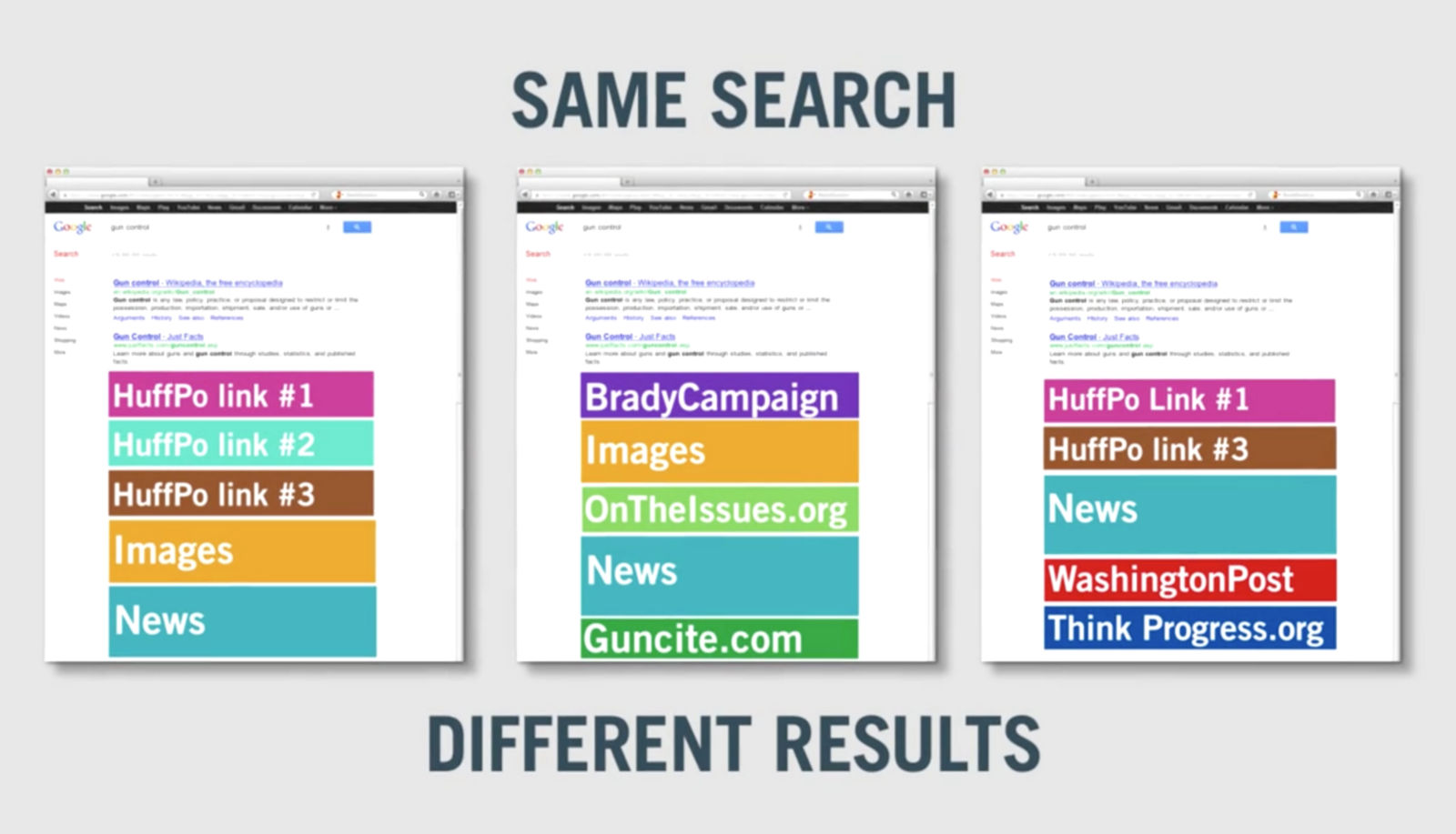 Los filtros burbuja son particularmente dañinos en el contexto de las búsquedas porque esperas ver lo mismo que otras personas. Crees que estás viendo los “resultados”. Hemos realizado investigaciones a lo largo de los años en las que le pedimos a la gente que buscara los mismos temas en Google al mismo tiempo y en modo “incógnito”, y nos percatamos de que estaban adaptados de manera significativa.