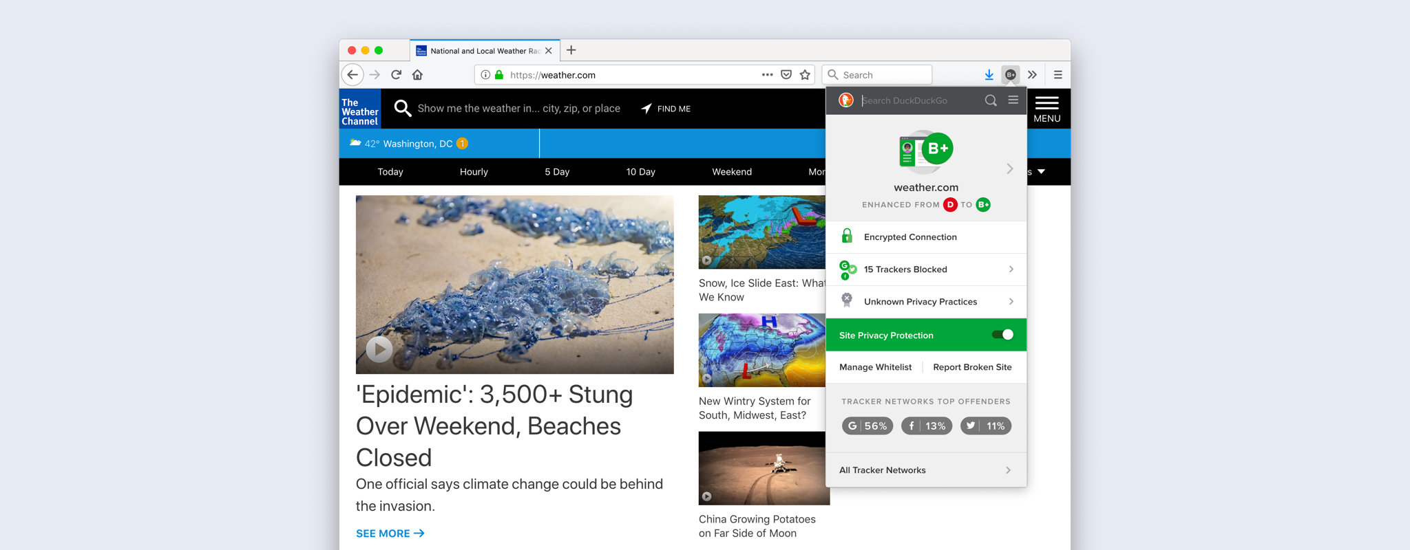Our DuckDuckGo Privacy Essentials (browser extension shown) is another way we put you in control of your data, with our Privacy Protection feature. We give each website you visit a Privacy Grade based on how safe it is. When Privacy Protection is turned on, we can make the site safer for you—improving its Privacy Grade. We don’t expect to change everyone’s browsing habits, like stopping you from going to sites that try to track you, but we can make this experience more transparent and safe.